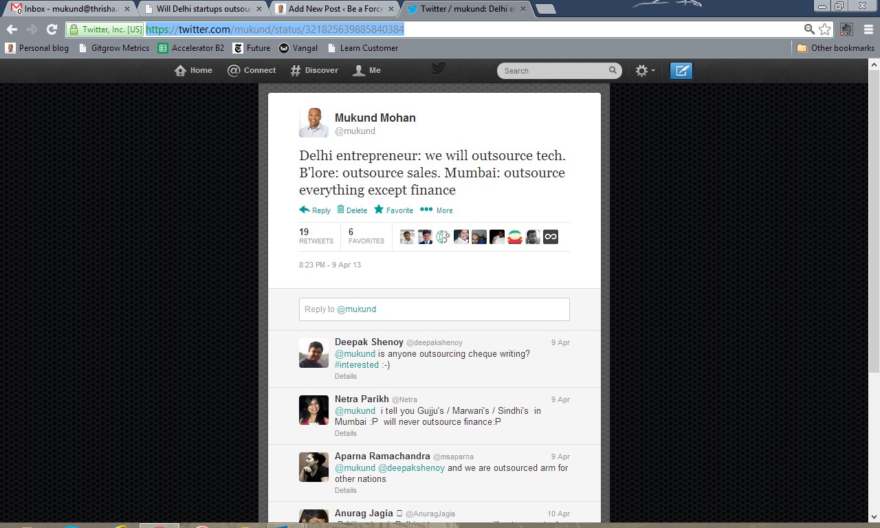 I put a half serious tweet last week based on several conversations I have had with entrepreneurs in Delhi, Mumbai, Pune, Bangalore and Chennai. I have been to Hyderabad as well, but the numbers are low.