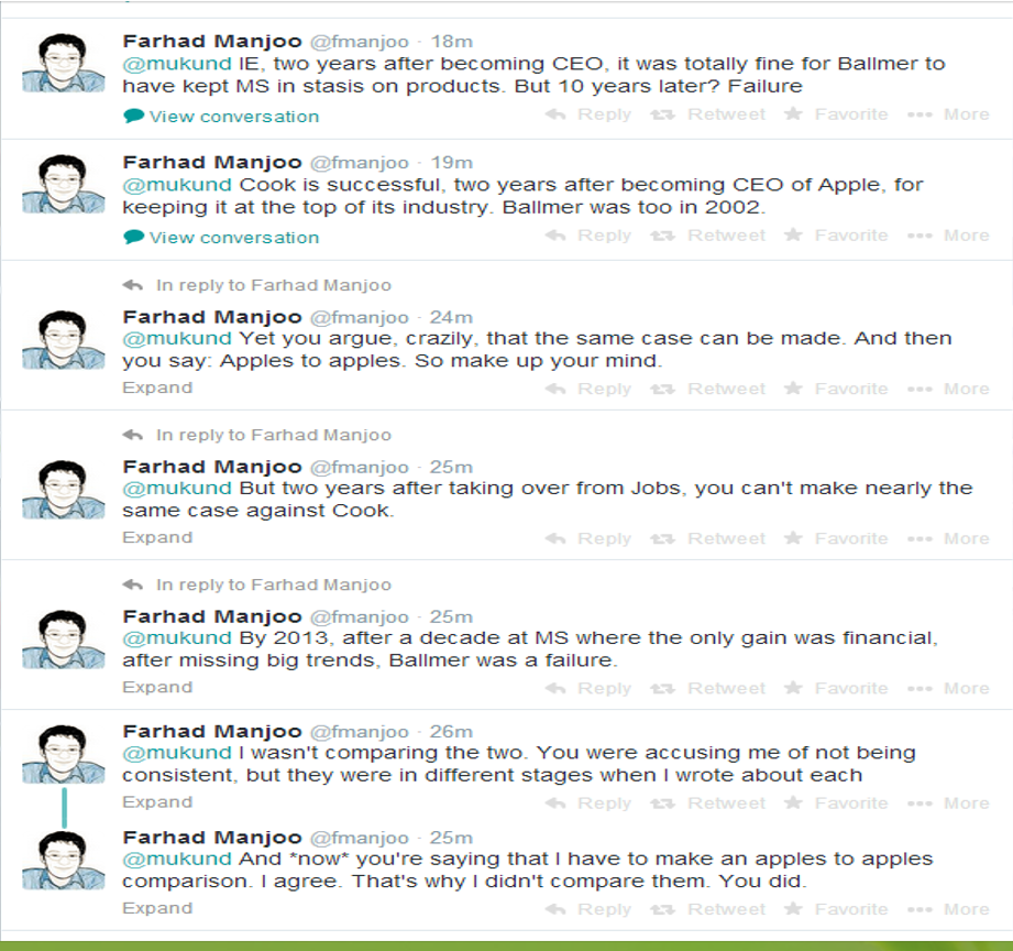 If you read Farhad’s piece on Steve Ballmer a few years ago on Slate, he was a bad CEO, because he moved from music players to XBOX to other things. He also said later, that Steve Sinofsky leaving meant the wrong Steve leaving.