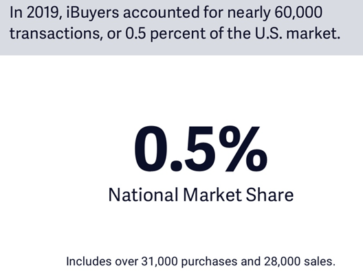 iBuying is very small as a segment (< 2% of homes sold in the US are bought / sold by iBuyers), but it is growing fast.