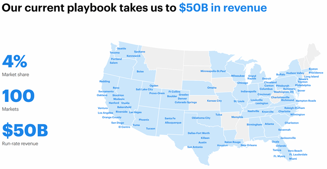 Currently the iBuyers are in the top 25-50 markets as the chart shows below. There are a total of 250+ markets in the US. So the penetration by the iBuyers is relatively small.
