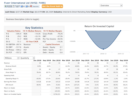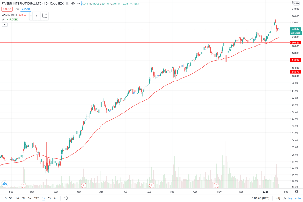 Fiverr (FVRR) is an online marketplace for freelance work. Founded in 2010, based in Israel, the company is currently priced at $240 (Jan 21 2020), with a Market Cap of $8.44B. The company is at an inflection point in terms of growth and revenue, recording $163M (+80% YoY) in Trailing Twelve Months (TTM) revenue. It is expected to grow at excess of 70% over 2021.