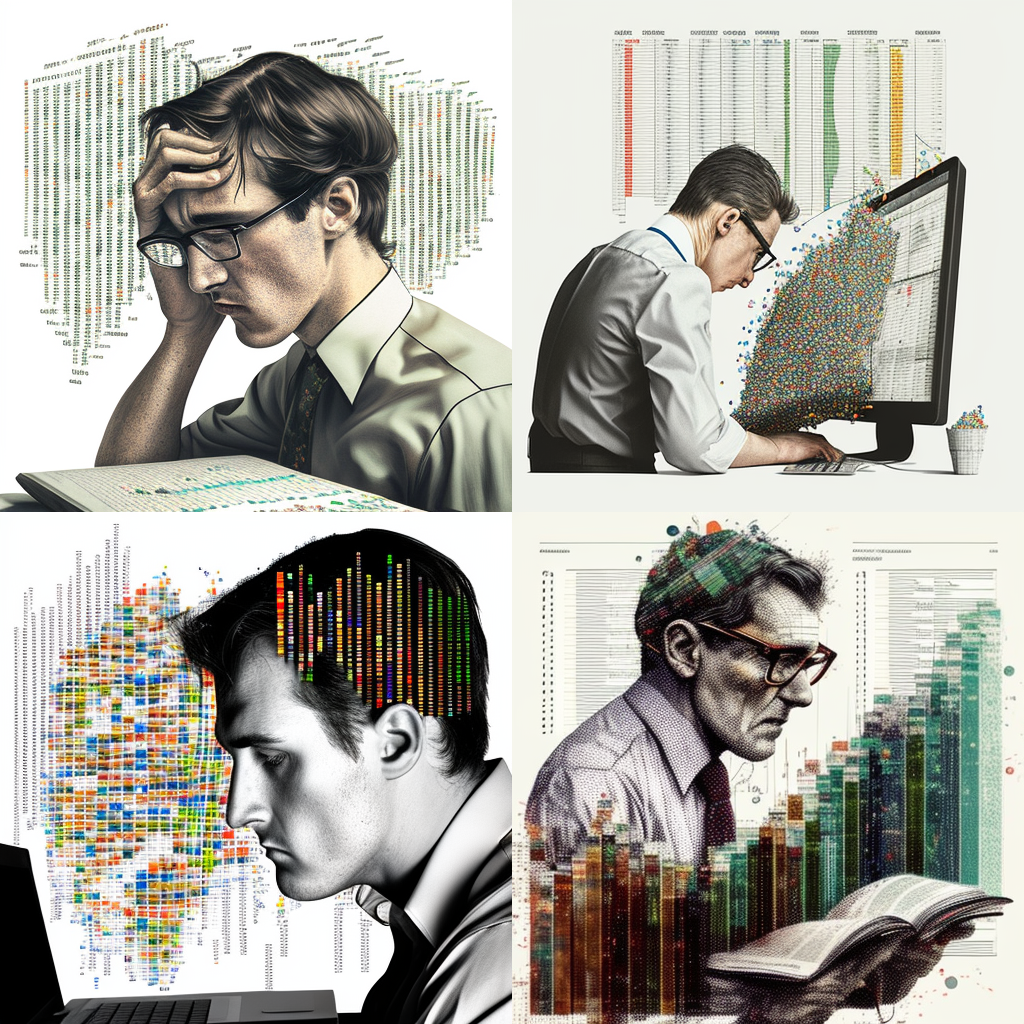 Created with MidJourney: a man with the drudgery of working with Excel, multiple queries, doing lots of data analysis