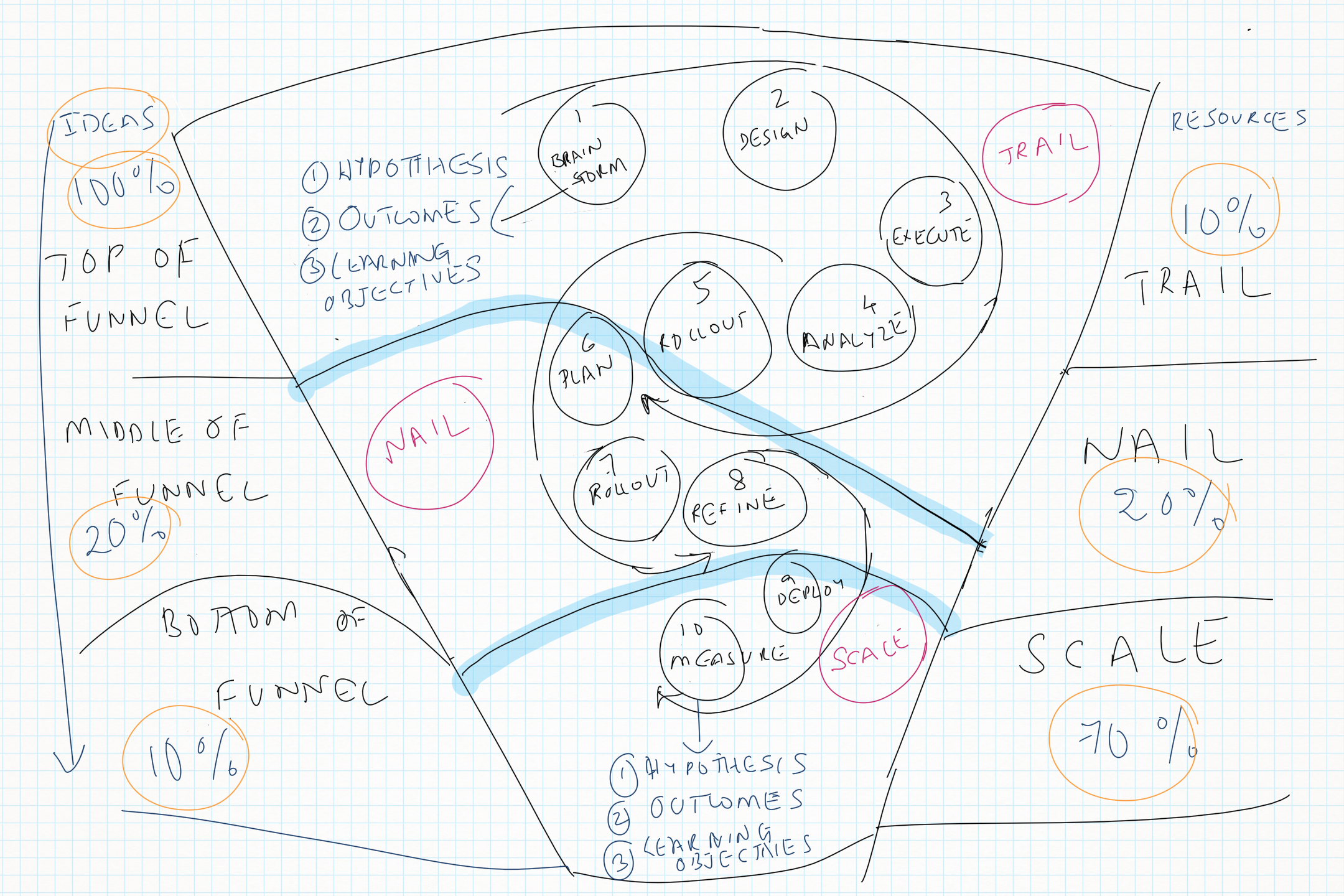 If you have 100% of your “experiments” when you start, (on the left of the graphic), then 20% (or less) will be nailed and 10% you will scale.