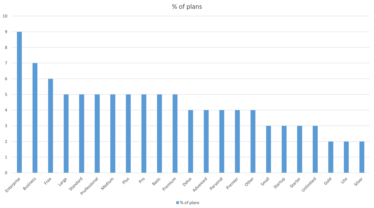 I did notice that of the 89 companies, 82 of them gave their pricing plans “names”. Each plan had a name so their customers could associate the name with the plan. Most (over 80%) used standard and conventional names but it was interesting to see the spread. Here is the data from 89 companies and 251 plans.