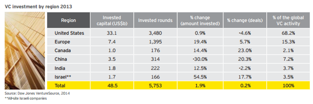If you look at 2013, US dominated with ~3500 funded startups by VC’s and that represented ~70% of all tech startups funded. There were a total of 5700 companies that got funded by VC’s alone, worldwide.